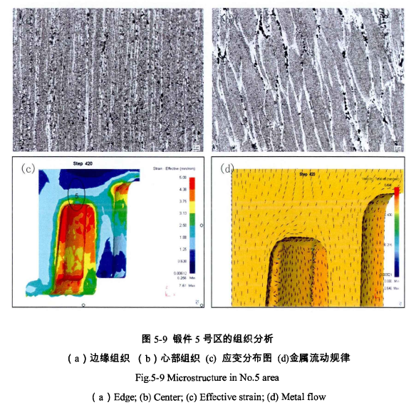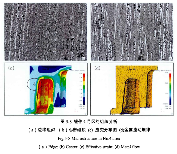 圖5-8是輪轂紹合金鍛件號區固溶時效態顯微組織、等效應變和金屬流動圖。輪轂鍛件4號區為杯型外圈底端區域。鍛件4號區靠近鍛件邊緣處顯微組織如圖5-8(a)所示,鍛件4號區鍛件邊緣內部的顯微組織如圖5-8(b)所示。此區域由于發生了強烈的塑性變形,產生強等效應變區,金屬流線取向明顯,白色條帶再結區域細小而平直,化合物破碎程度較高。等效應變分布圖5-8(c)所示,特別是靠近下模邊緣處有一定寬度的強烈變形區域。金屬流動規律圖5-8(d)所示,金屬流動規律復雜變形初期,此處的金屬來源于還料邊緣區域;變形末期,輪緣的填充過程中金屬通過此處流向輪緣,直到輪轂輪緣完成成形才停止流動。