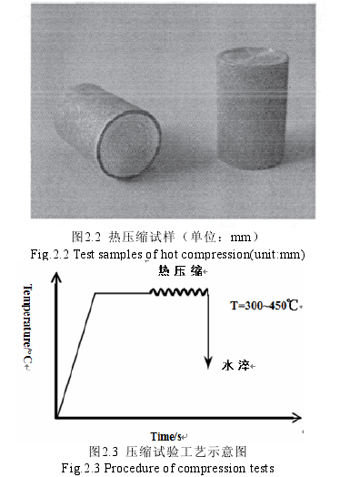試驗所用的原始坯料尺寸為Φ250mm,均勻化退火后在鑄錠D/4直徑處取尺寸為Φ8mmX 12mm的圓柱體試樣,如圖2.2所示。在本校的Gleeble-1500D熱力模擬試驗機上進行軸對稱高溫壓縮試驗。為了消除接觸面上的摩擦,使壓縮試樣處于單向應力狀態,在實驗過程中,試樣的兩端墊有石墨紙。熱壓縮試樣以30℃/S的加熱速度加熱至變形溫度,保溫3 min后進行熱壓縮,變形后試樣快速進行水淬處理,保留高溫熱變形后的組織。在實驗過程中,由Gleeble-1500D熱模擬機的計算機自動采集壓力、溫度、位移、真應力、真應變、時間等變形條件的試驗數據,數據整理并經Origin軟件繪制出真應力一真應變曲線。試驗工藝如圖2.3 。