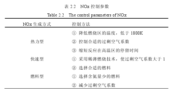 通過對NOx的生成機理分析介紹,鎮對不同的生成機理各因素的影響程度也有所區別,如溫度對三種生成機理的影響區別較大。針對NOx不同的生成機理,采用合理的控制參數及控制方法如下表所示