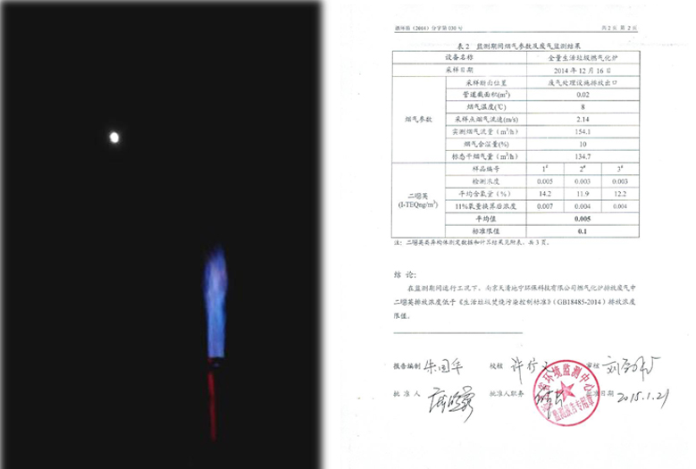 首次克服了垃圾處理產業繞不開的二噁英排放難題,經浙江省環境監測中心監測,煙氣二噁英毒性總當量僅僅為0.004-0.007ngTEQ/m³(均值0.005ngTEQ/m³的排放指標遠低于2014年頒布的國內新標準和歐盟標準的0.1 ngTEQ/m³ ),目前無任何文獻和技術能達到。
